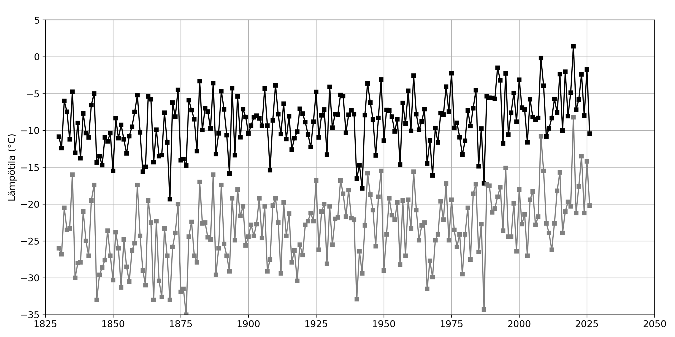 Kuva 1. Talven kylmimmän 30 päivän jakson keskilämpötila (ylempi musta käyrä) ja koko talven alin hetkellinen lämpötila (alempi harmaa käyrä) Helsingin Kaisaniemessä talvina 1829/1830–2025/2026. Talvien 1829/1830–1843/1844 alimmat lämpötilat on määritetty kolme kertaa päivässä tehtyjen havaintojen perusteella.