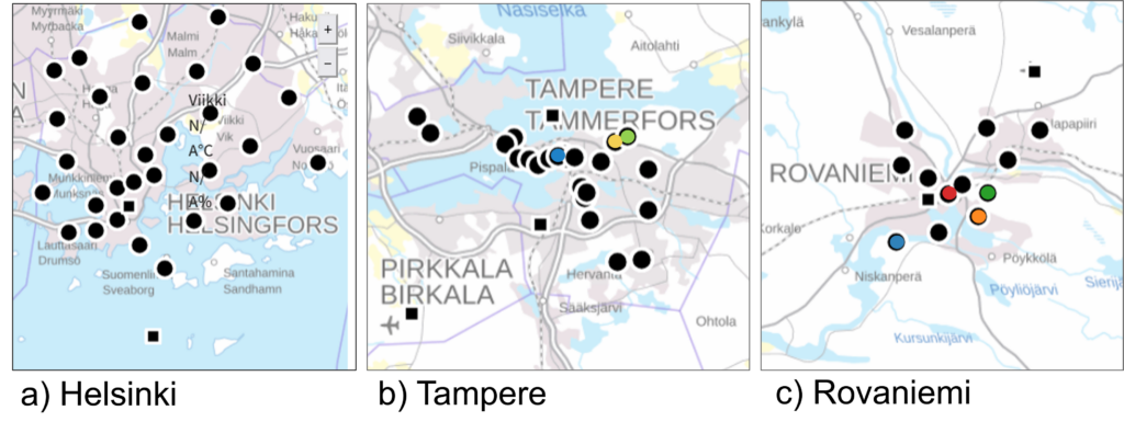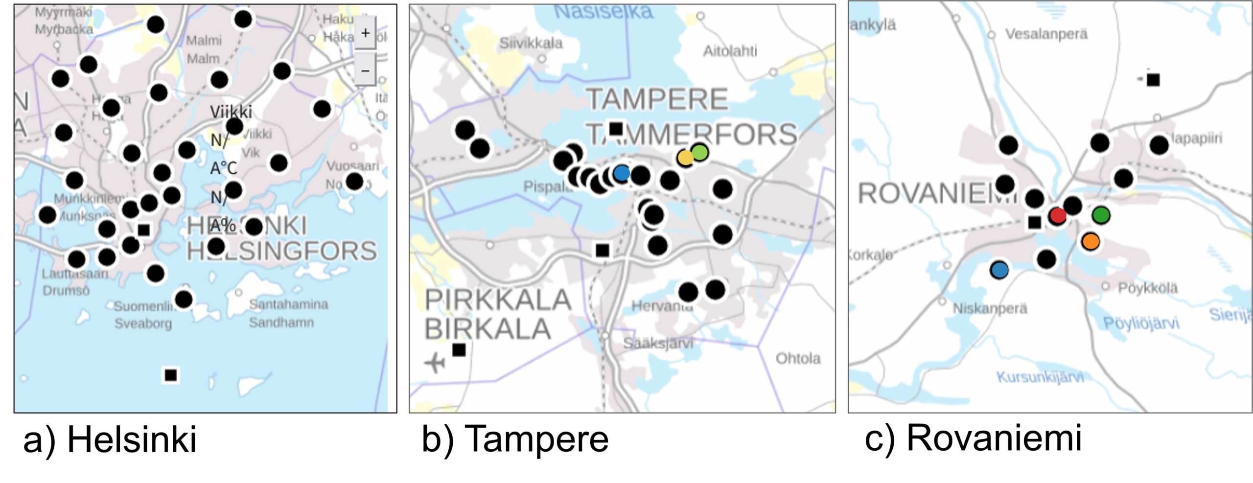 Laapas, M., Pirinen, P., Korhonen, N., Kühn, T., Ruuhela, R., Gregow, H. (2025): Utilizing dense network of urban measurements for spatial interpolation in Helsinki, Tampere, and Rovaniemi, Abstract Book of ACCC-FASN Science Conference 2025(2025), Report Series in Aerosol Science No. 304 (2025), 148-149. https://www.acccflagship.fi/wp-content/uploads/ACCC2025_abstract_book-compressed.pdf