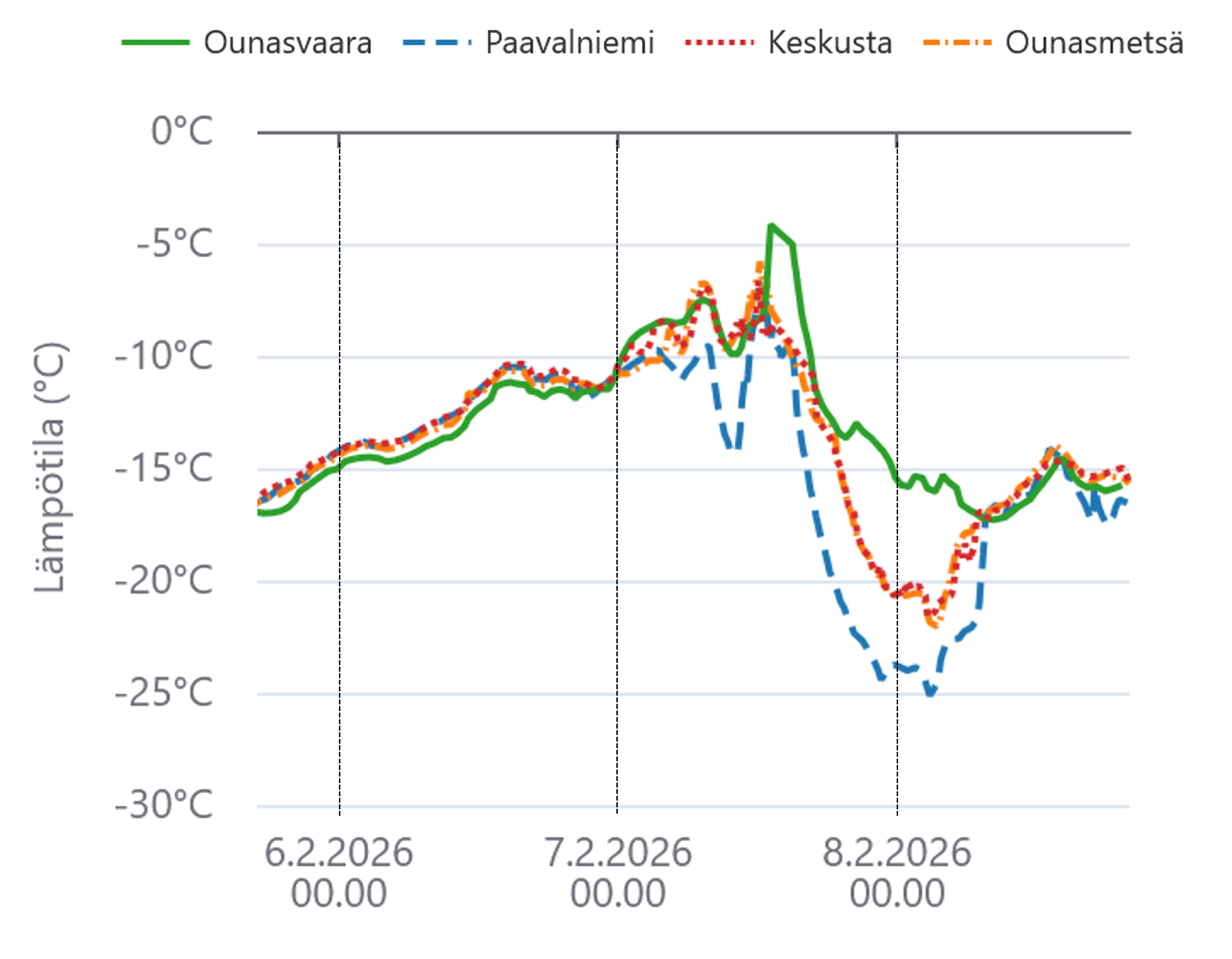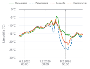 Rovaniemen mittausverkoston sijoittelussa haluttiin tuoda esille kaupungin maastonkorkeuden vaihtelun vaikutus lämpötilaan erityisesti inversiotilanteiden aikana. Esimerkiksi 8. helmikuuta 2026 vallinneen inversiotilanteen aikana (kuva 2) Ounasvaaran asemalla (193 m mpy = merenpinnan yläpuolella) mitattiin 5–10 astetta korkeampia lämpötiloja kuin alempana kaupungissa (n. 80 m mpy).