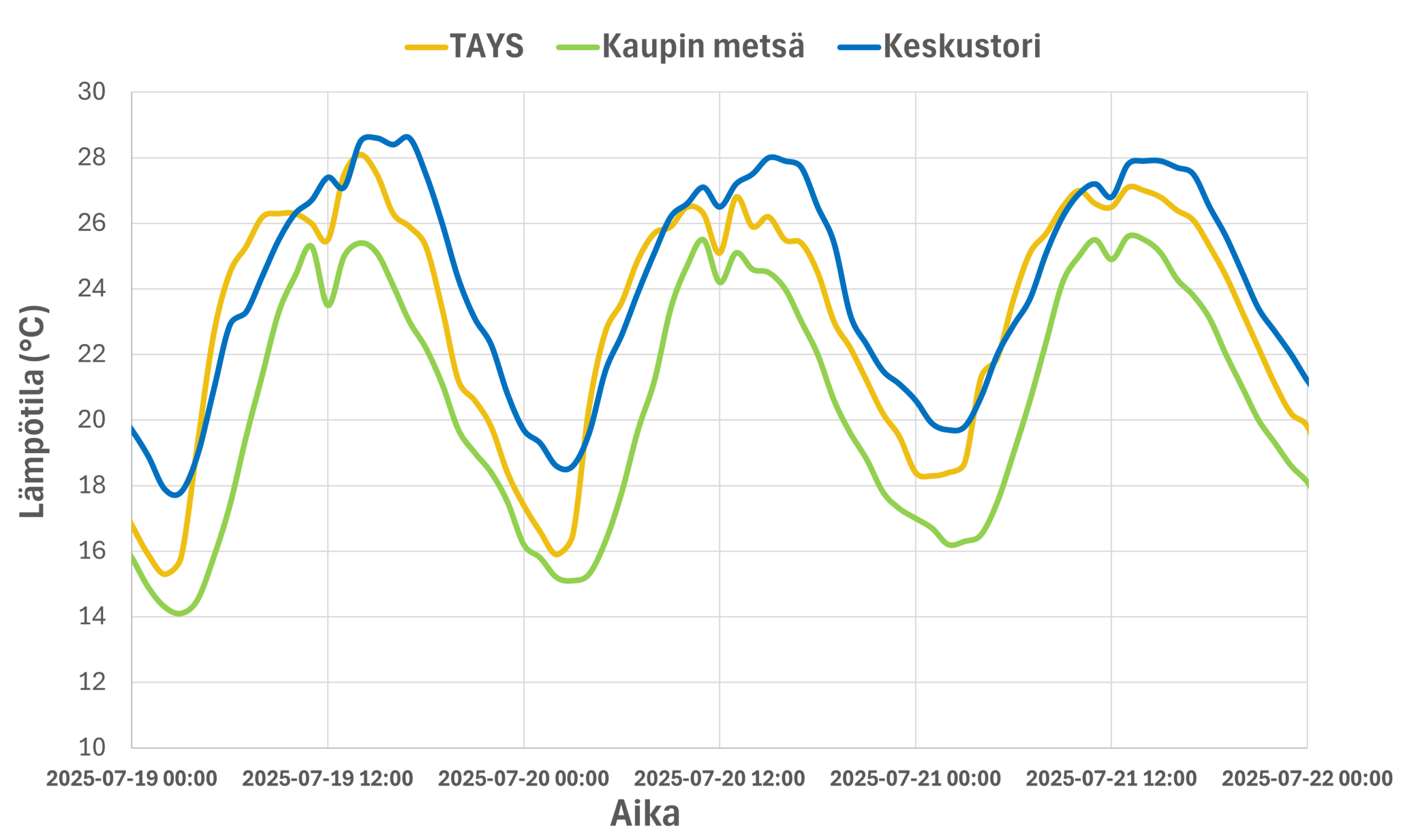 Tampereen mittausverkoston sijoittelussa painotettiin erityisesti viheralueiden vaikutusta lämpötilaan. Kesähelteillä Tampereella voidaan esimerkiksi verrata Tampereen yliopistollisen sairaalan (TAYS) alueen ja sitä ympäröivän Kaupin metsäalueen lämpötiloja (kuva 3), jolloin viheralueiden useamman asteen viilentävä vaikutus tulee selvästi esiin.