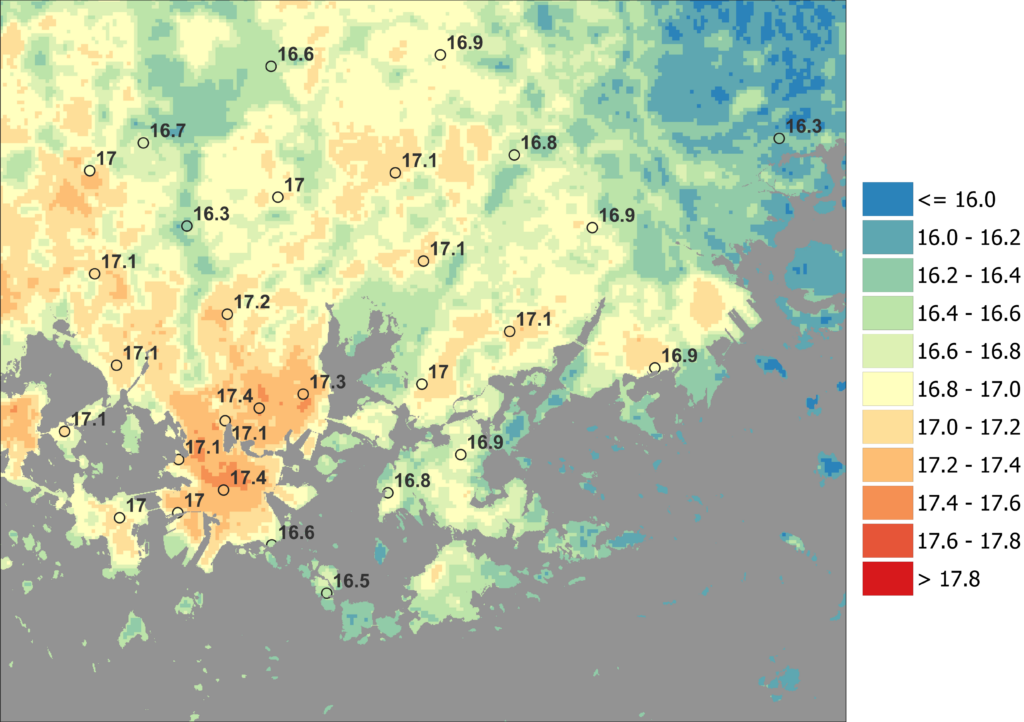 TAPSI-hankkeessa kehitetty menetelmä (Laapas ym. 2025) yhdistää kaupunkimittausasemien havainnot kaupunkiympäristöä kuvaavaan tietoon – kuten maanpinnan korkeuteen sekä rakennusten, viheralueiden ja vesistöjen määrään – ja mahdollistaa lämpötilan arvioinnin koko kaupungin alueella myös mittausasemien ulkopuolella. Kuvassa 4 on esitetty arvio kesän 2025 keskilämpötilasta Helsingissä kaupunkimittausverkoston ja kaupunkiympäristöä kuvaavien taustatietojen avulla. Vaikka lämpötilaerot kaupungin eri osien välillä ovat vain noin asteen luokkaa, kartalta erottuvat selvästi meren viilentävä vaikutus rantaviivan tuntumassa, keskustan lämpimämmät alueet sekä metsäisten alueiden viileämmät vyöhykkeet.