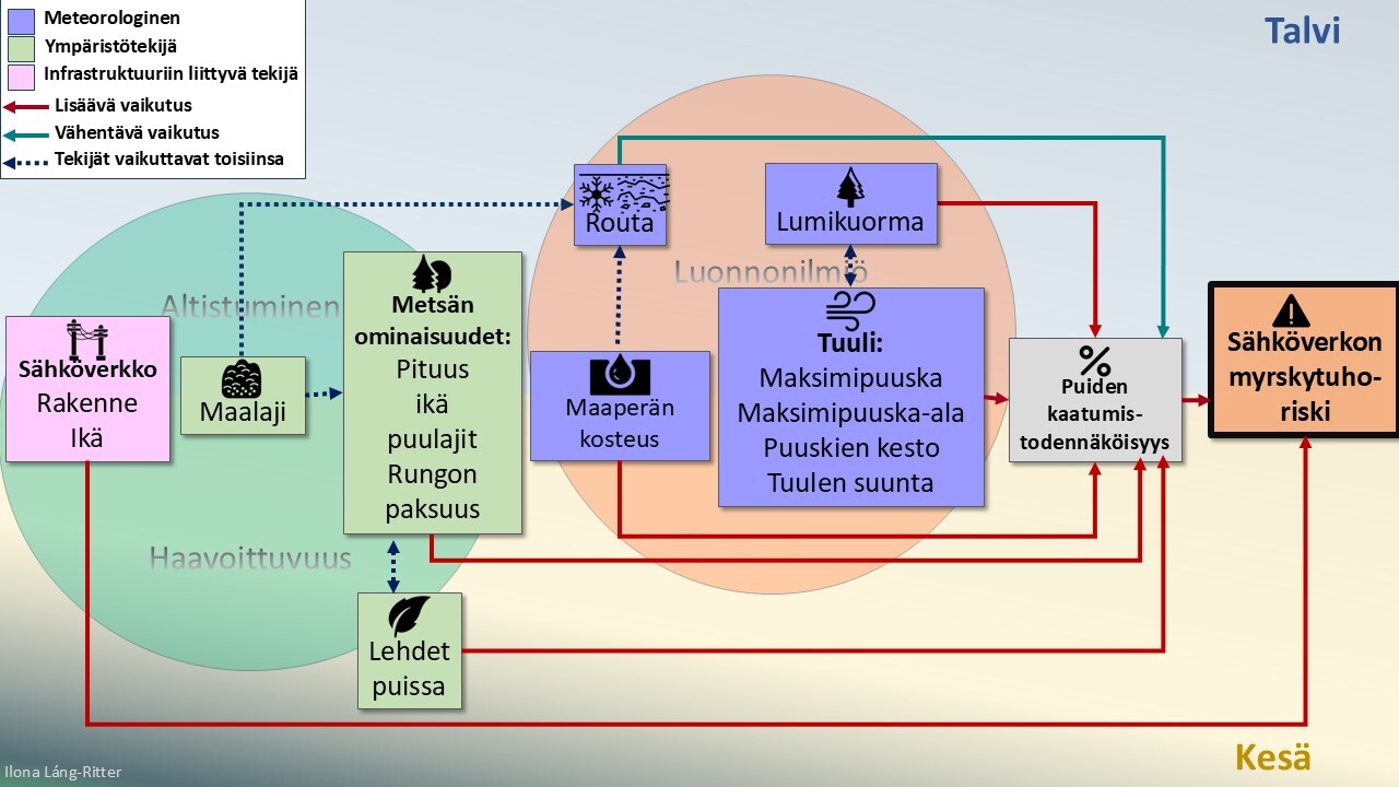 Suomessa on haja-asutusalueilla edelleen paljon metsissä kulkevia ilmasähköjohtoja, ja matalapainemyrskyjen merkittävimpiin vaikutuksiin meillä lukeutuvat voimakkaiden tuulien aiheuttamat laajat sähkökatkot. Hiljattain julkaistussa väitöstutkimuksessa osoitettiin, että myrskyvahinkojen aiheuttamien sähkökatkojen määrä riippuu monista eri tekijöistä, joiden yhteisvaikutus muodostaa monimutkaisen kokonaisuuden (kuva 1).